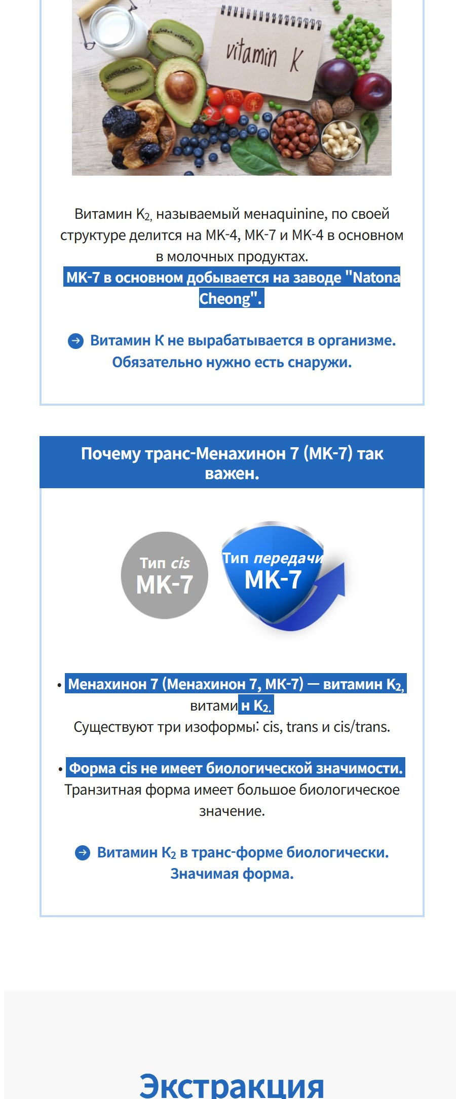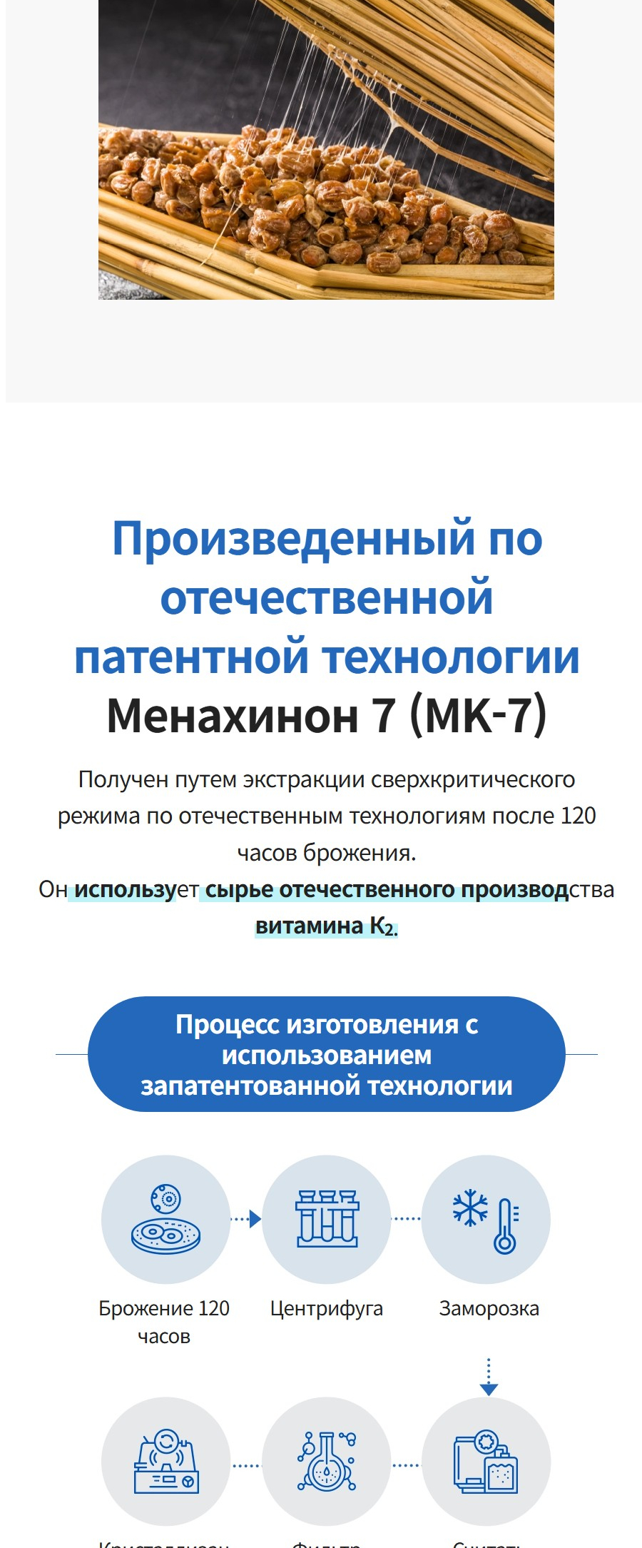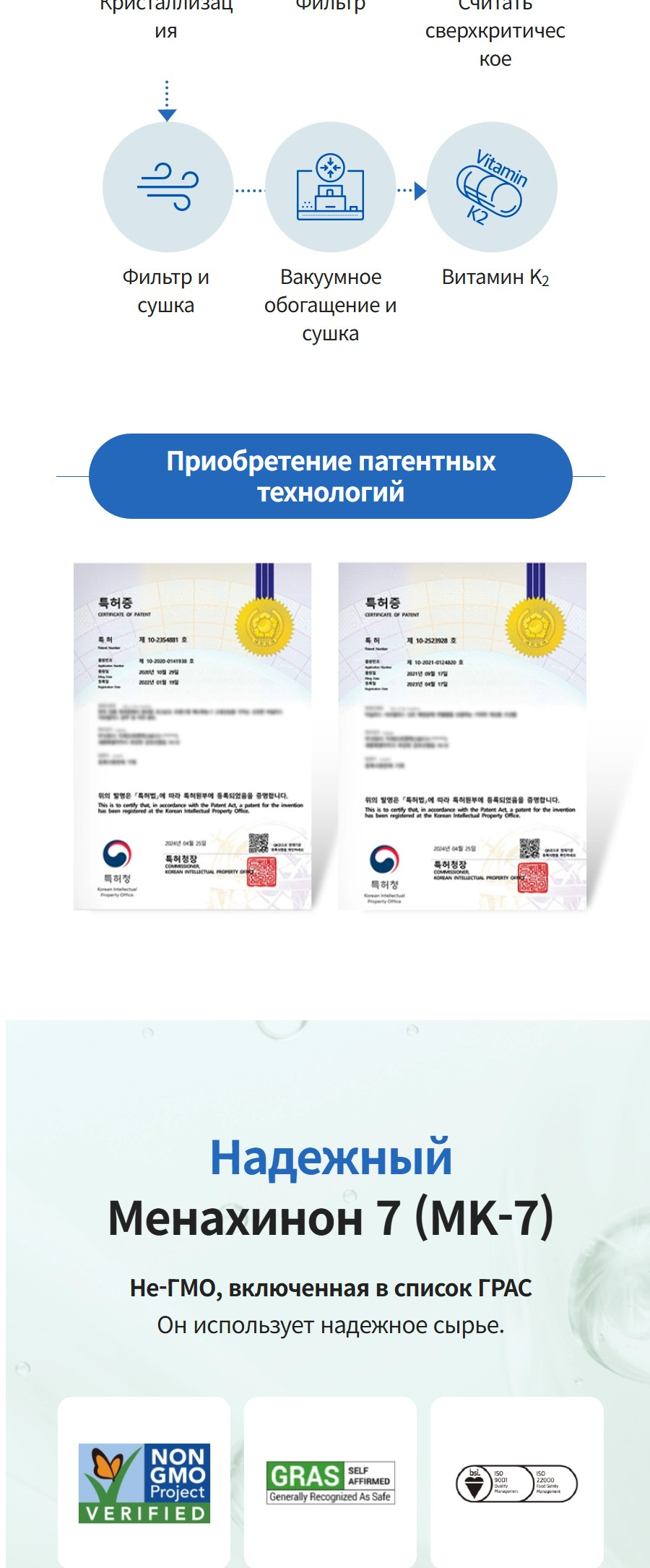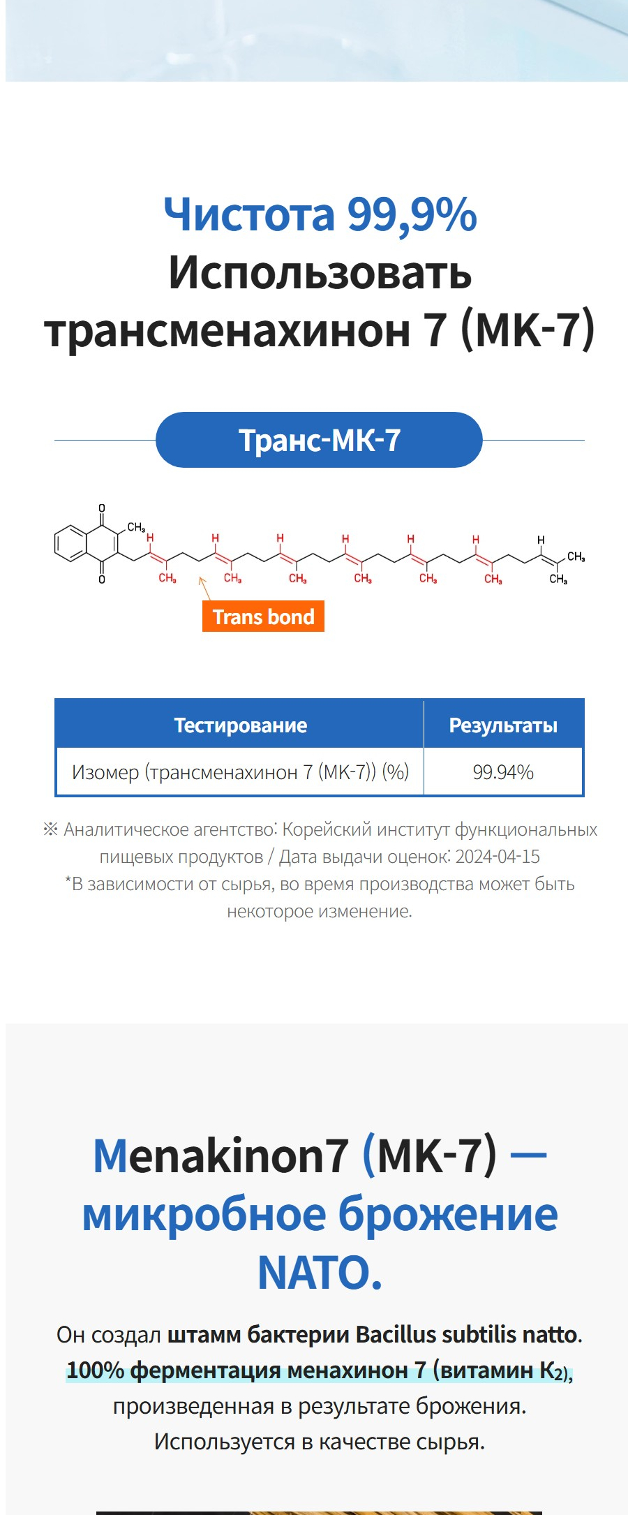 Подходит для людей с малой физической активностью, офисных работников, пожилых, а также тех, кто заботится о здоровье костей и сосудов. Используется чистейшая форма K₂ (99,9%), полученная методом ферментации из японского натто. Сырьё — от DSM (Швейцария), мирового лидера в производстве витаминов и нутрицевтиков. Это фармацевтическое качество, сертифицированное по международным стандартам GMP и ISO.