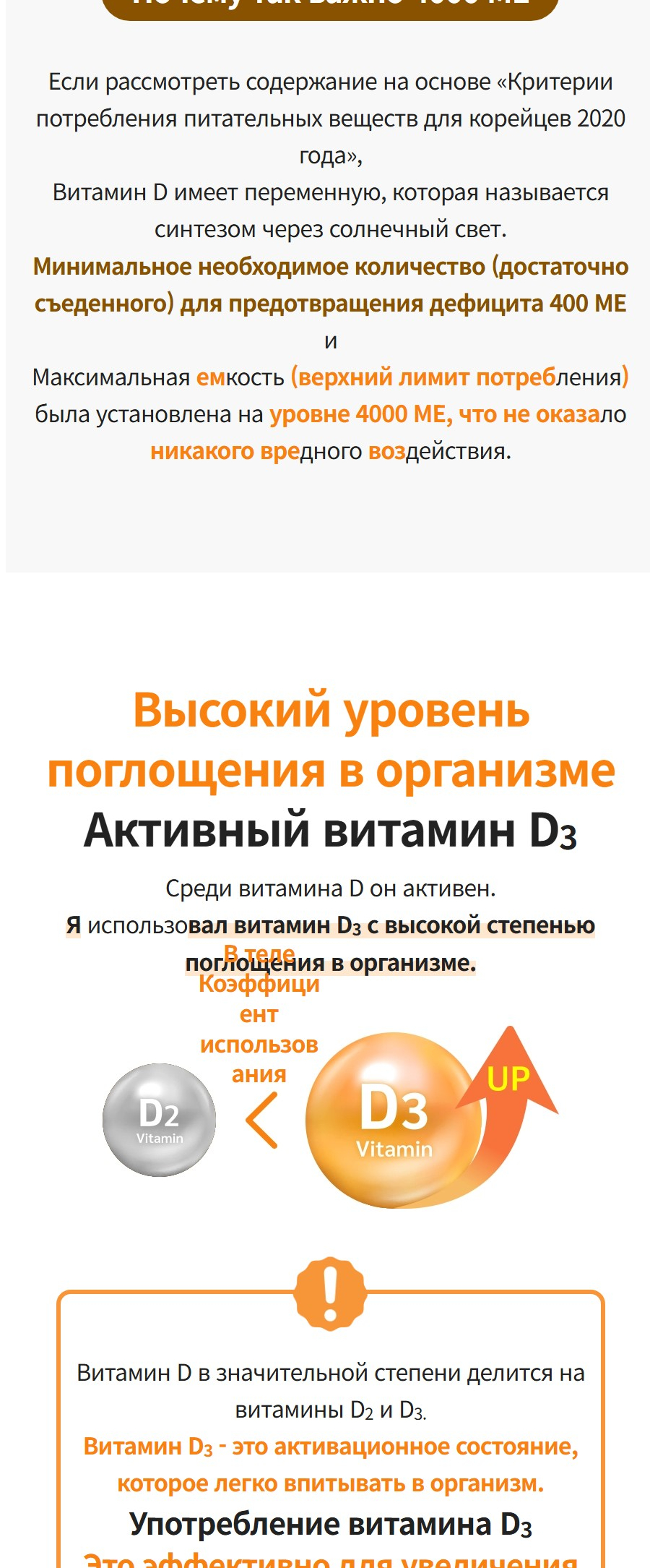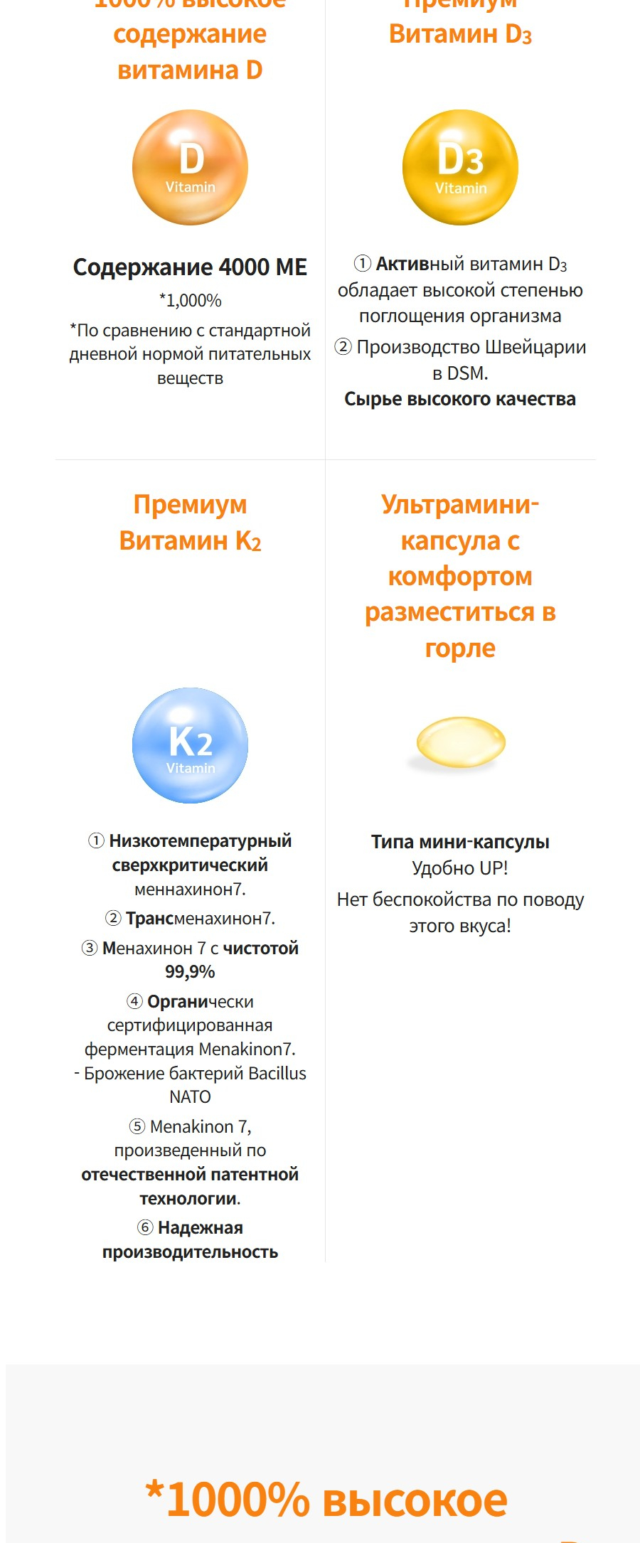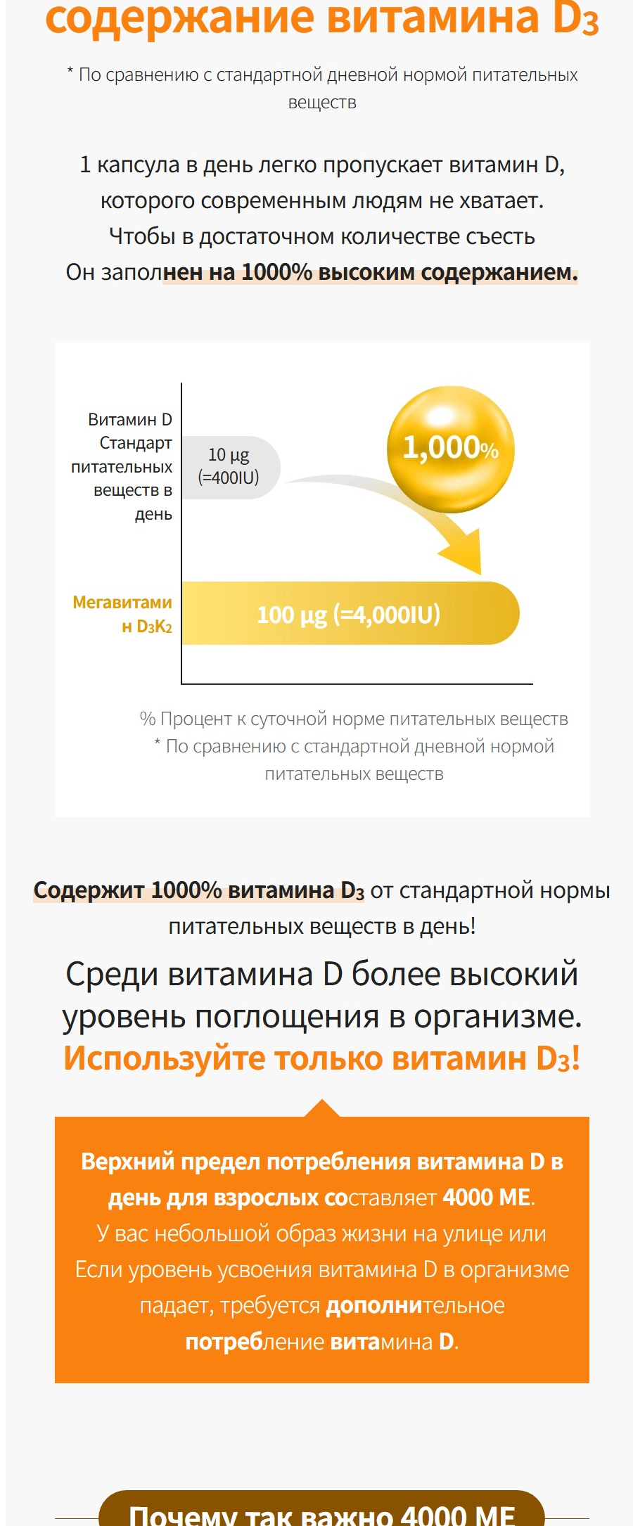 — 1000% суточной нормы D₃ (4000 IU) — безопасная, научно обоснованная доза для восполнения дефицита.